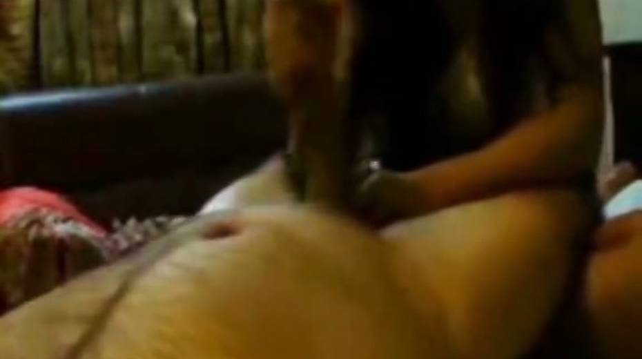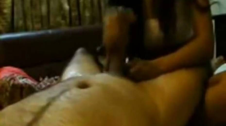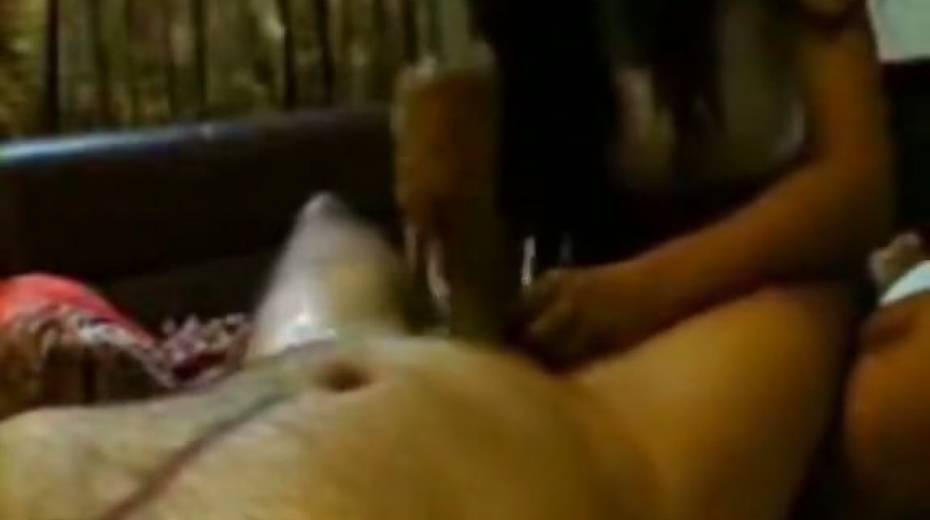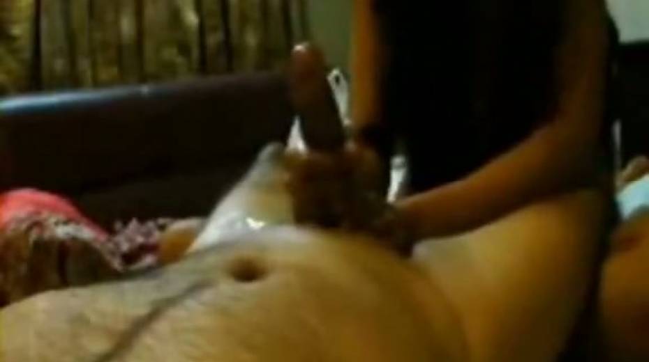 Slutty and horny bitch in sexy dress gives a handjob to her dude