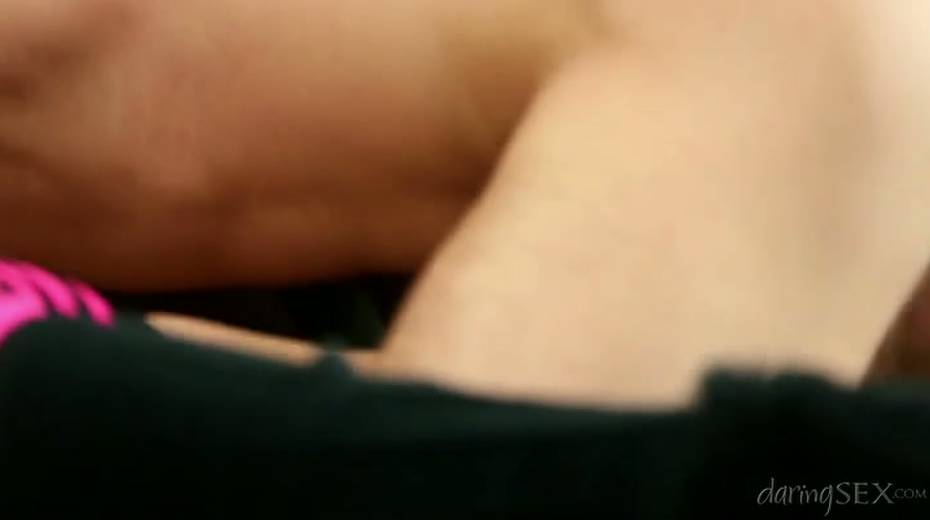 Frisky blonde in funny pink stockings gives her head and gets her pussy spooned from behind