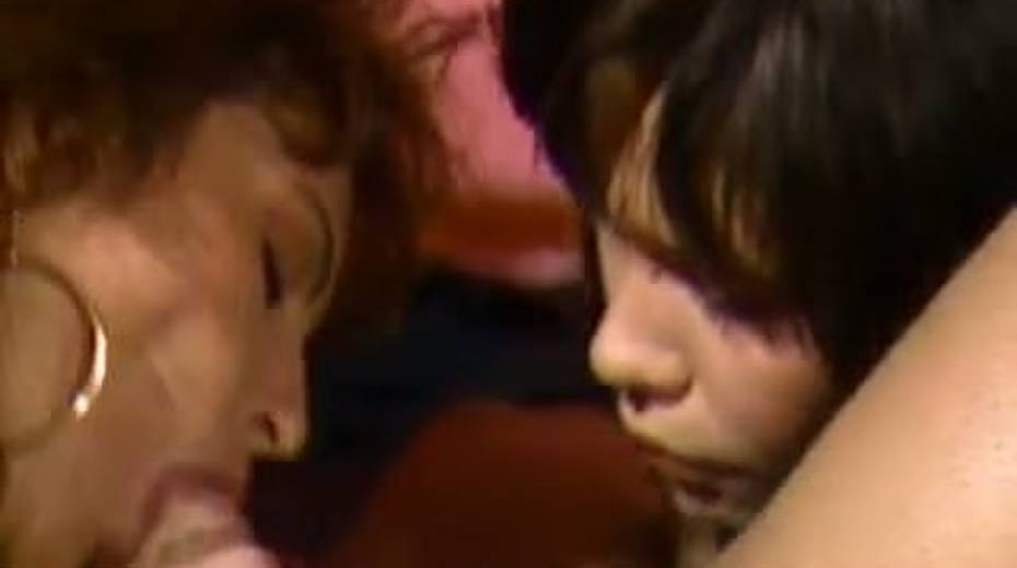 Two libidinous girlfriends pleasing one guy and giving him blowjob