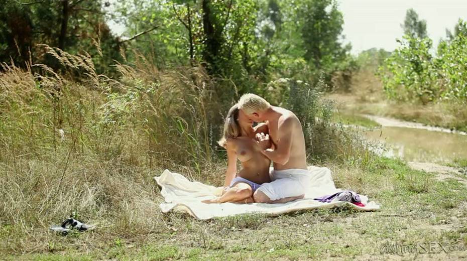 Hot blooded man eats sweet kitty of one sexy fair haired bitch outdoors