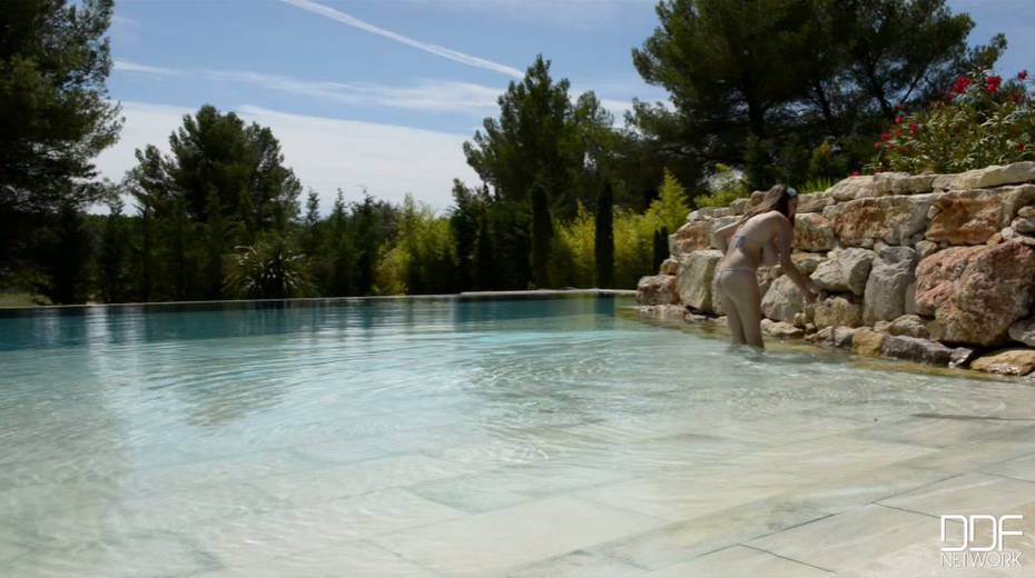 Salty chick with massive impressive boobs plays with glass dildo in the pool