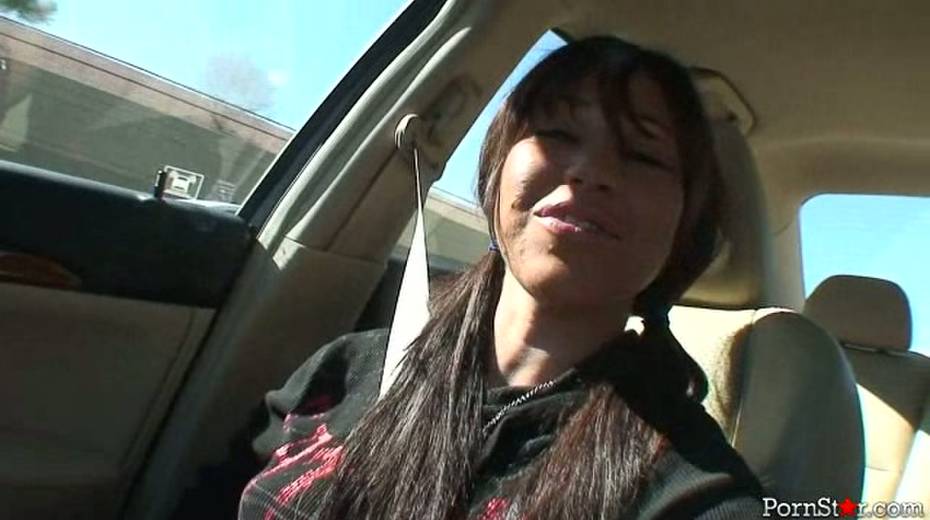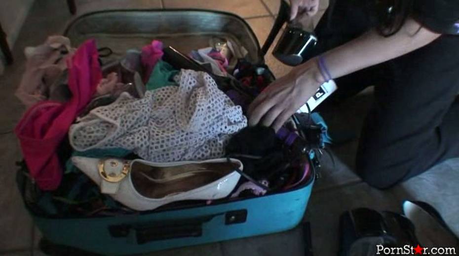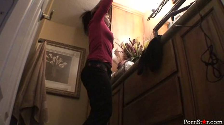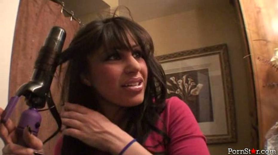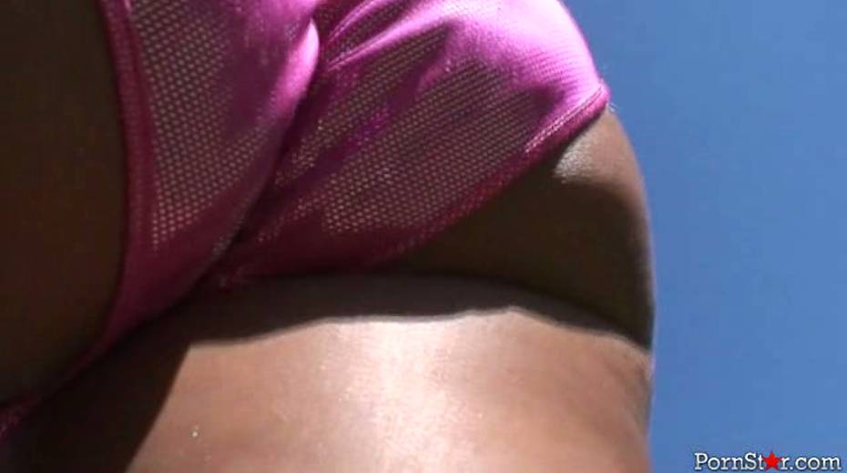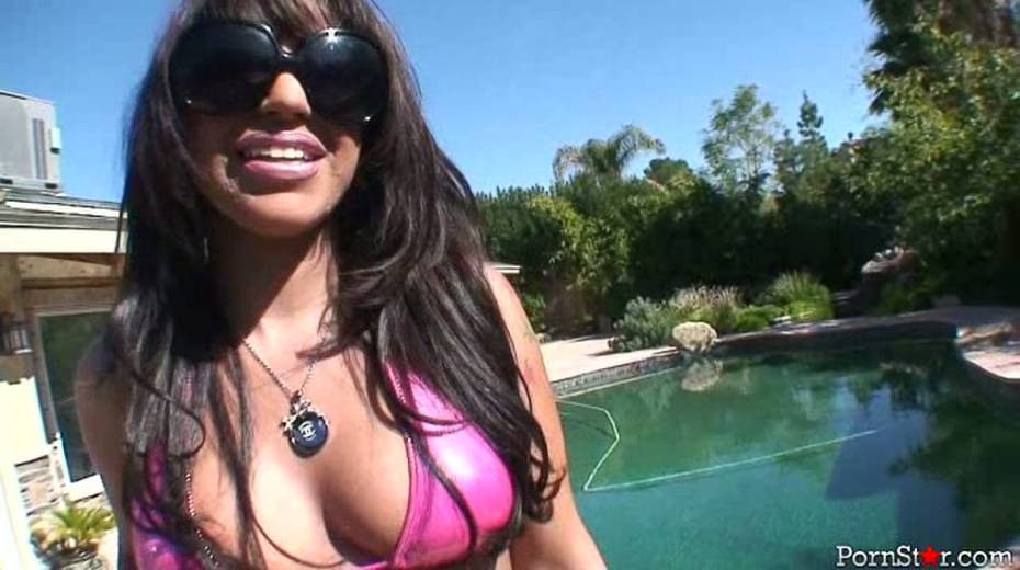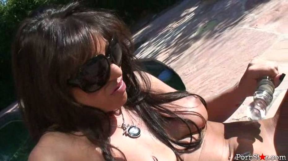 Naughty tanned brunette puts on bikini and masturbates by the pool