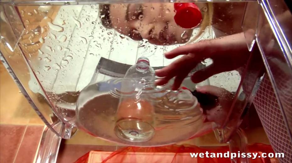 Bonny light haired hottie in sexy white stockings drinks her warm piss greedily