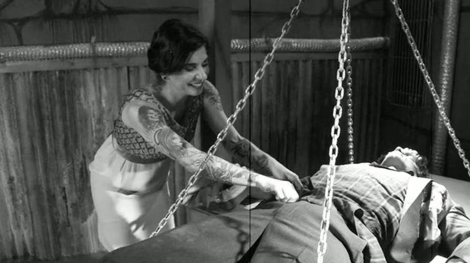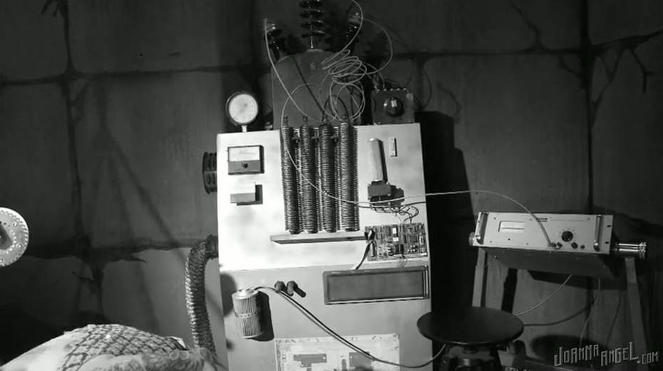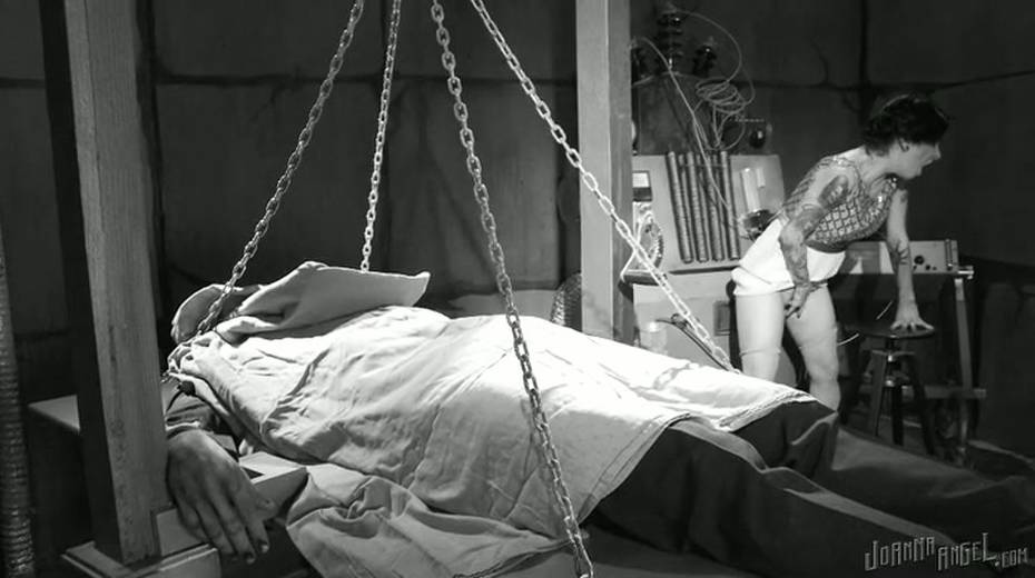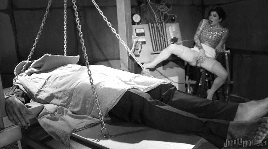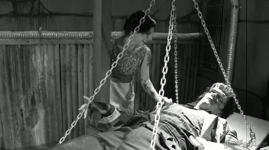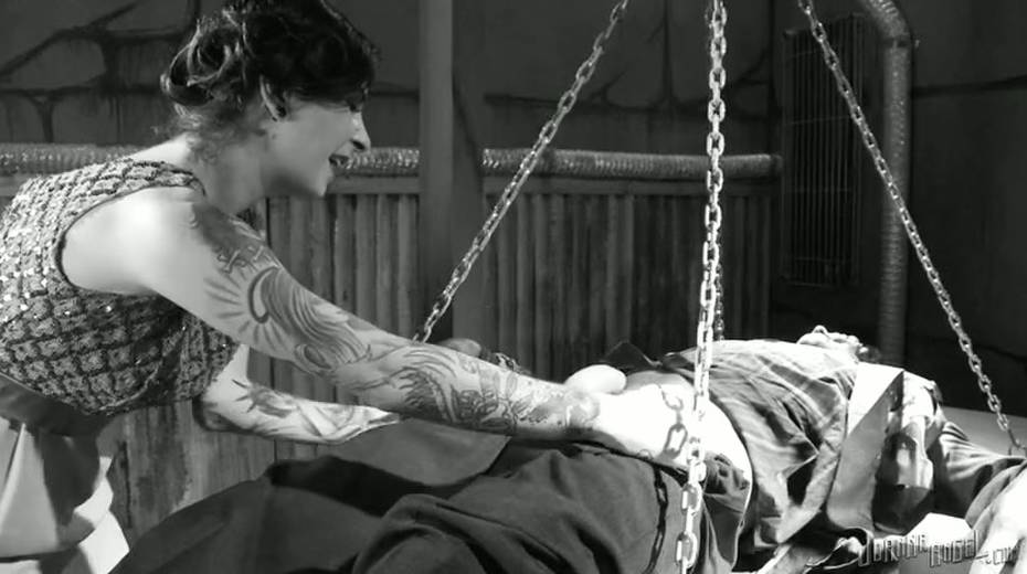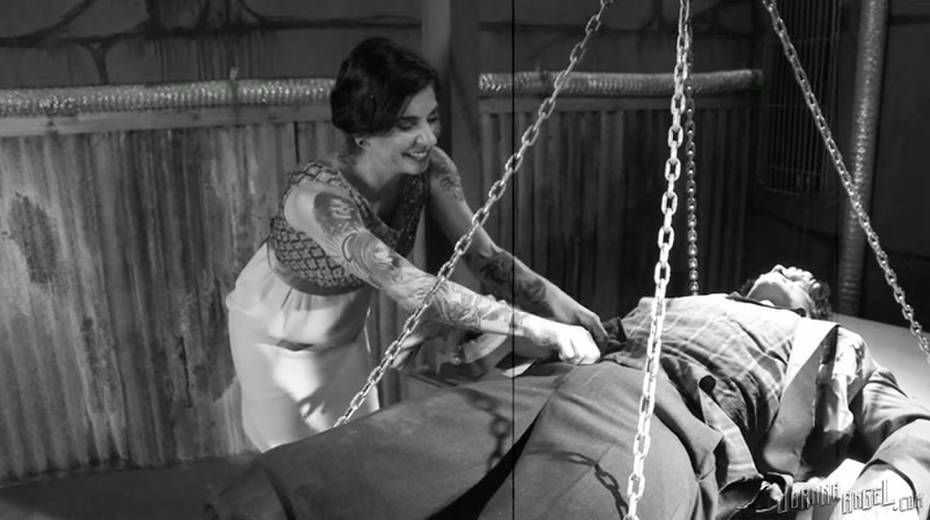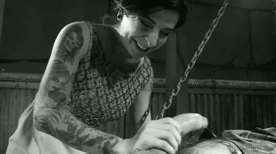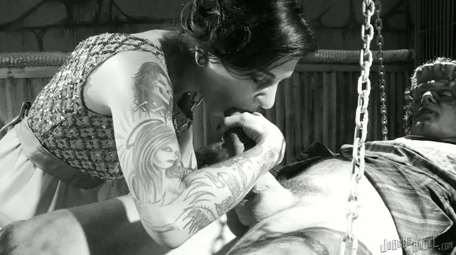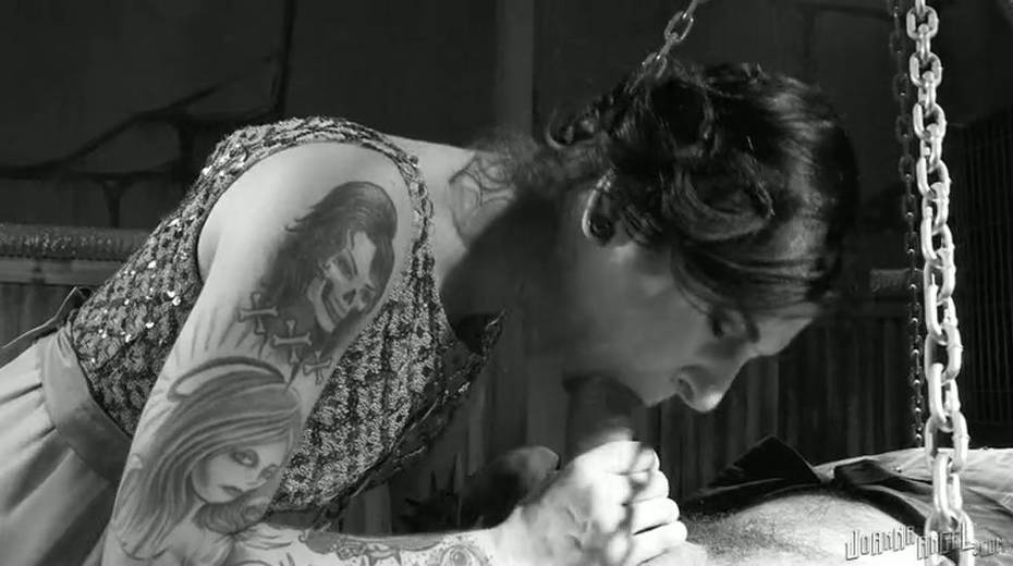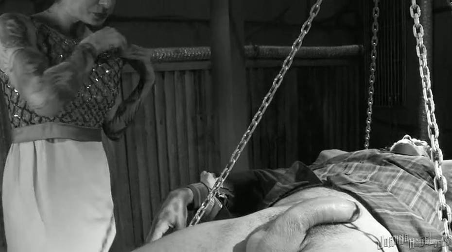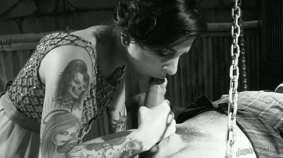 Bootyful brunette fingers her twat and sucks strong dick of chained dude
