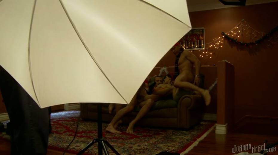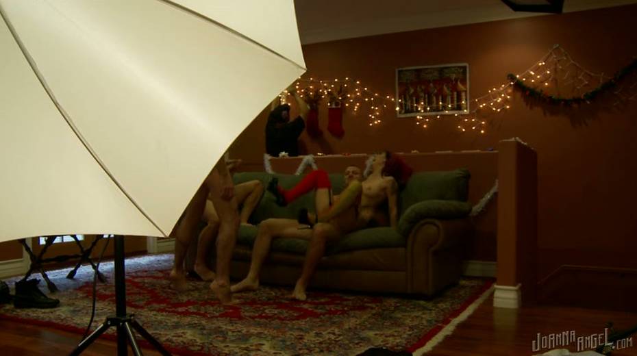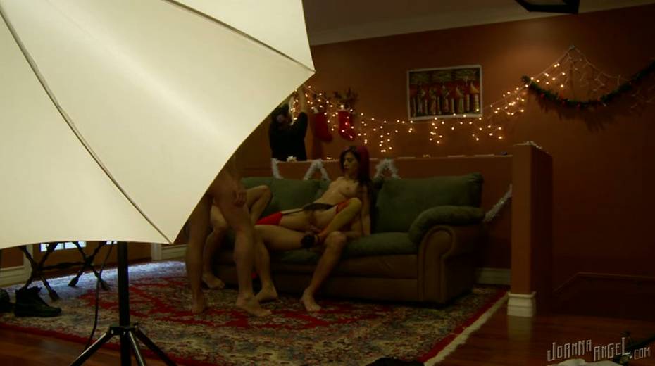 Two nasty Santa dudes fuck whorish chick in behind the scene video