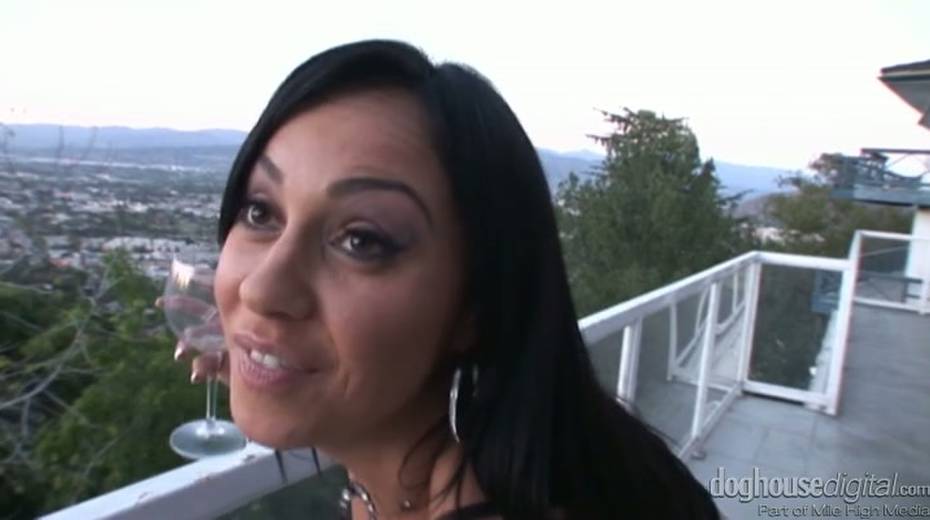 Big breasted appetizing brunette sexpot kneels down to give awesome blowjob