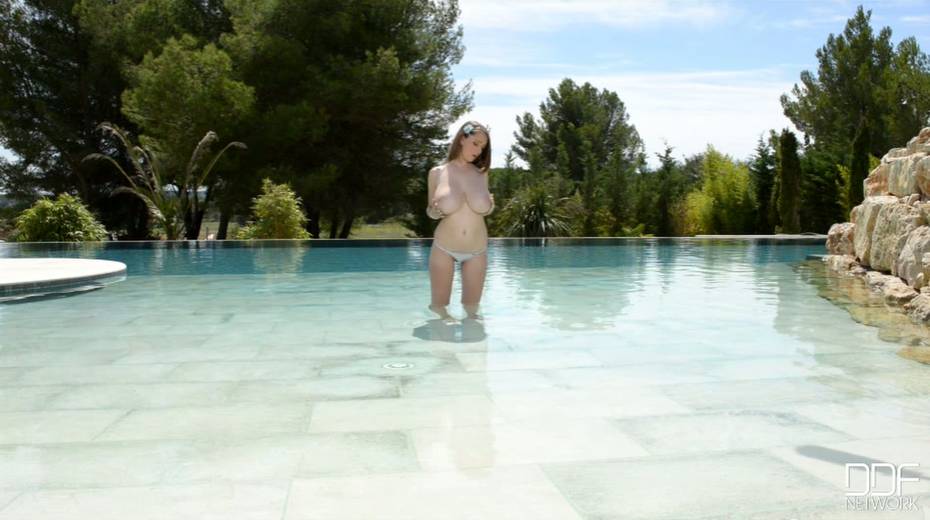 Huge tittied young brunette plays with her asses in the pool