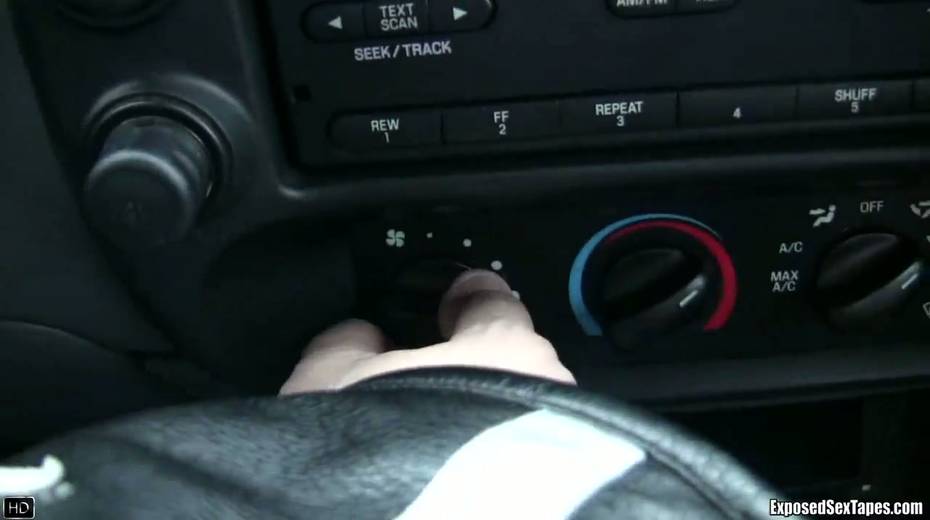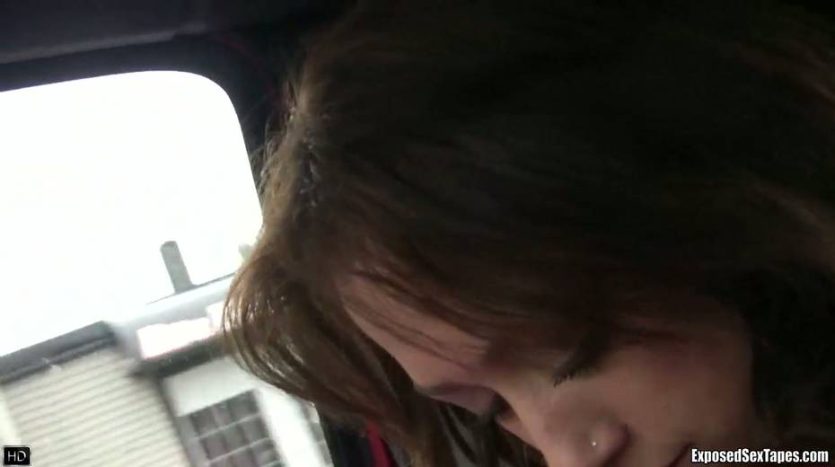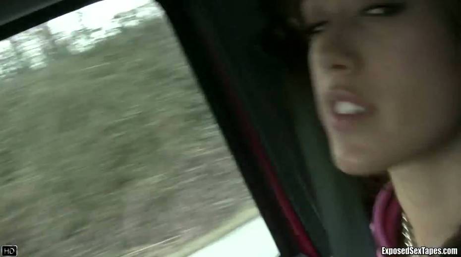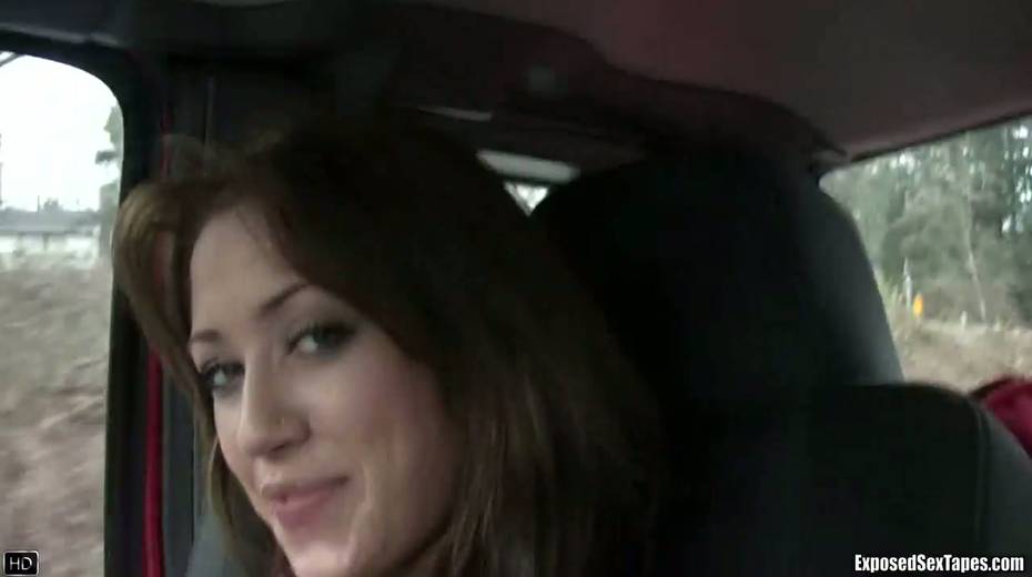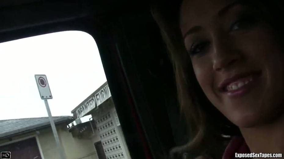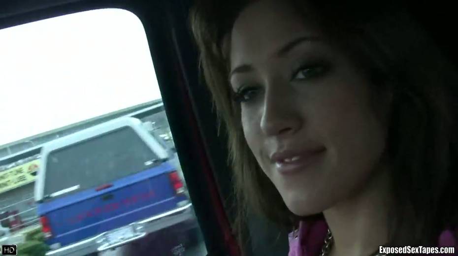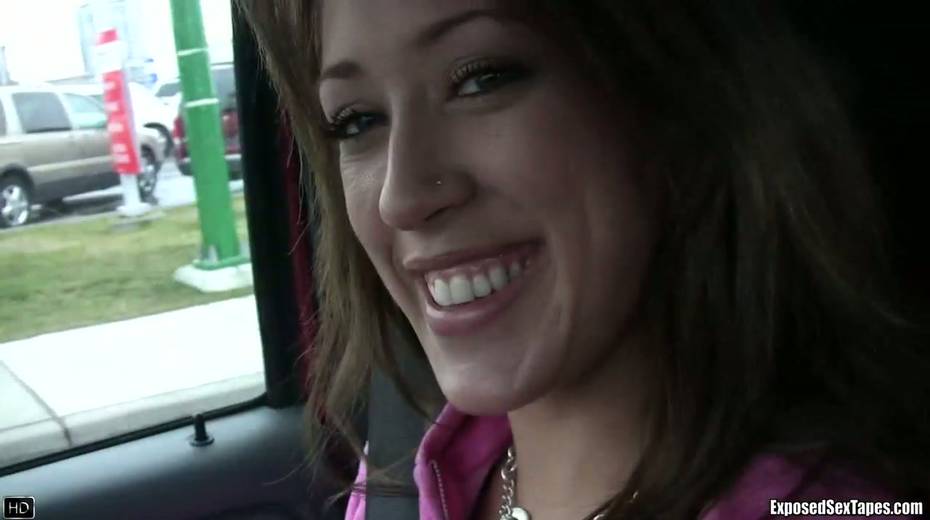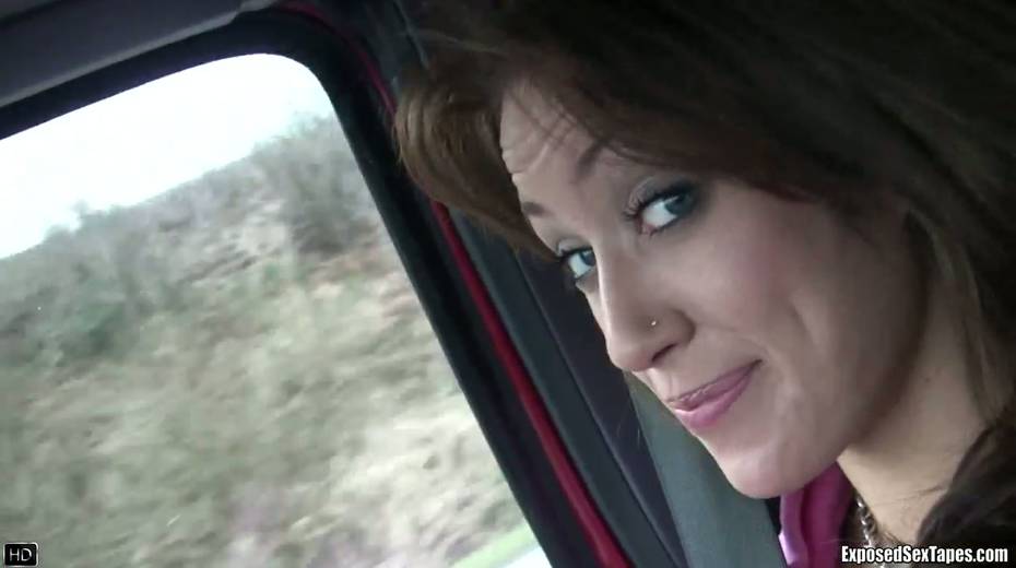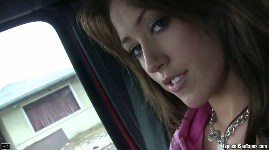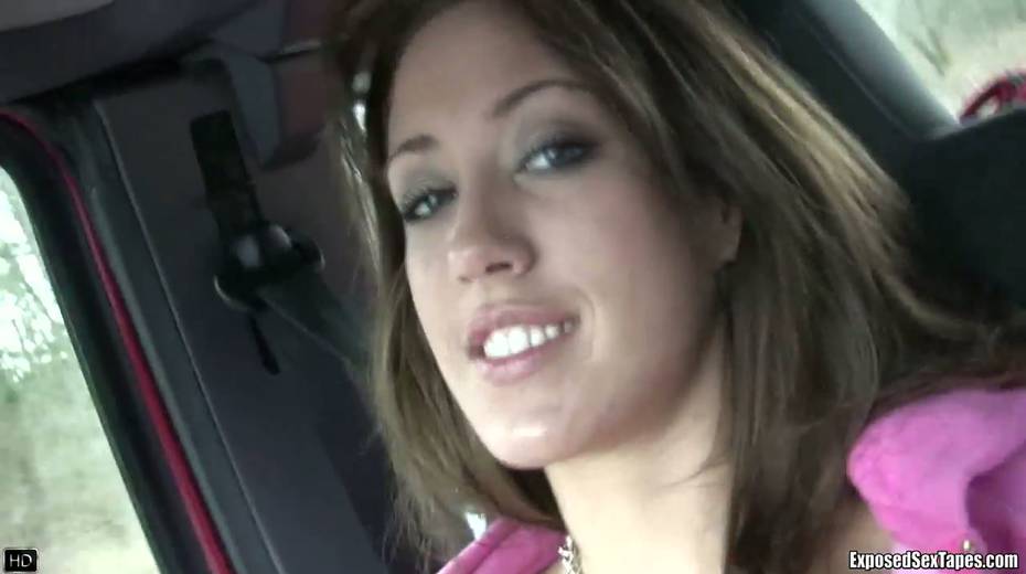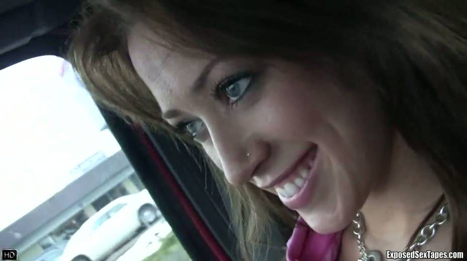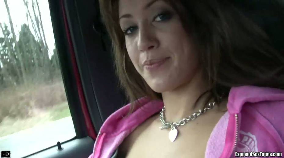 Lustful chick Bobbi shows off her small tits in the car