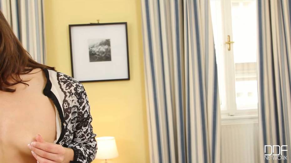 Perfect brunette babe in lingerie takes a dildo to masturbate her twat