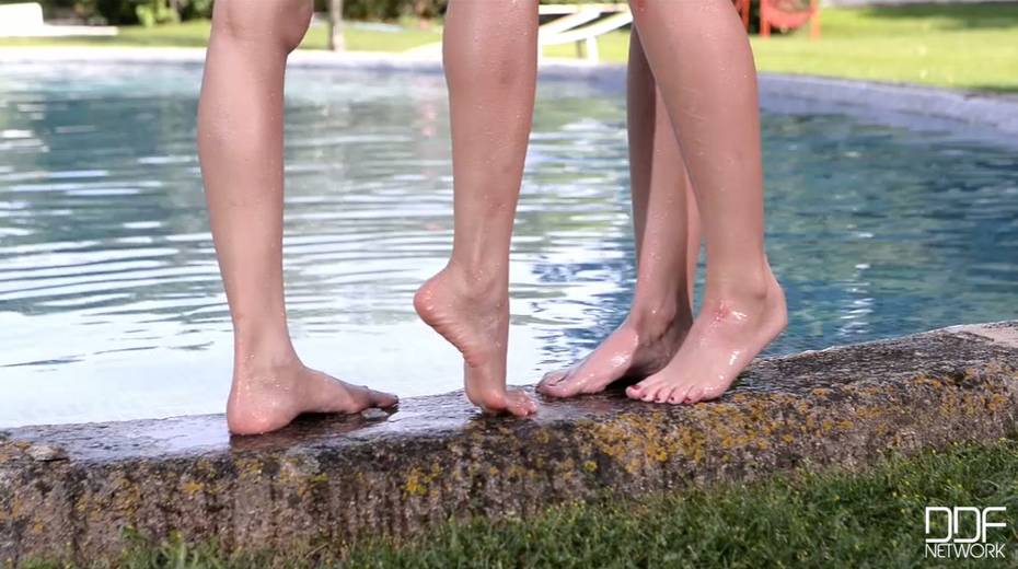 Two lubricious girlfriends suck each others feet by the pool side