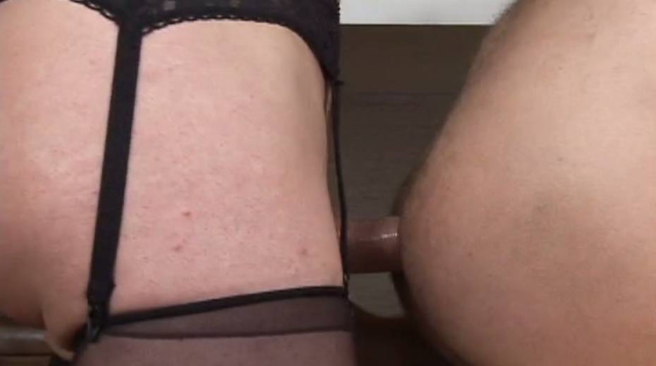 Dirty shemale whore wearing black stockings drills her boyfriend's anal hole in doggy pose