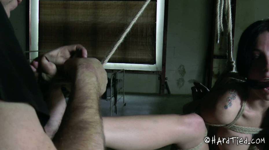 Hussy with sexy butterfly tattoo is tied up and suspended