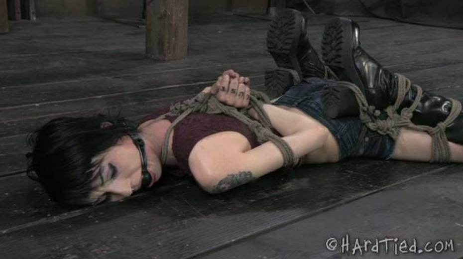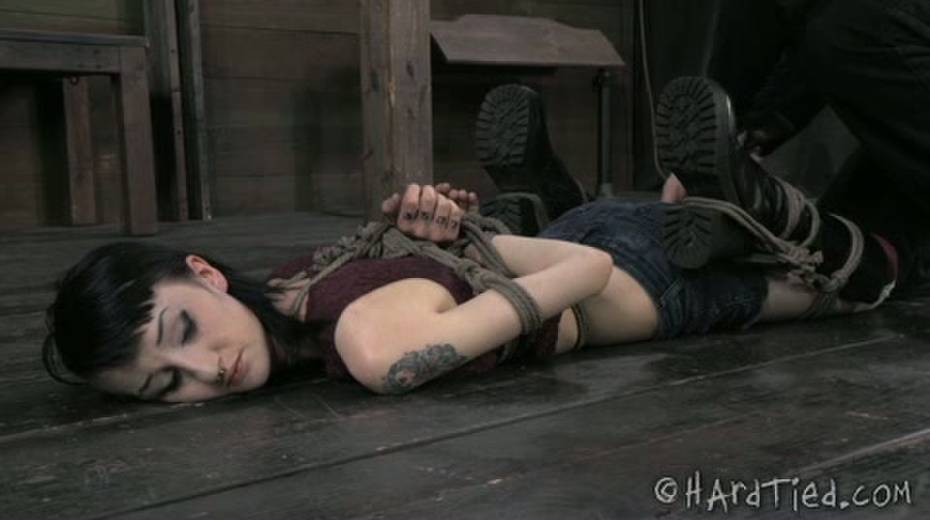 Brunette chick is lying on the floor with tied up hands