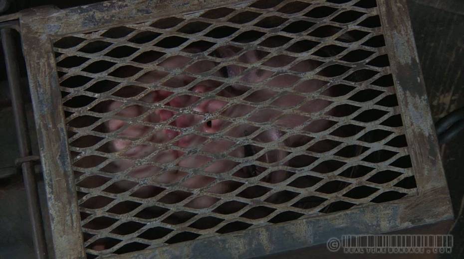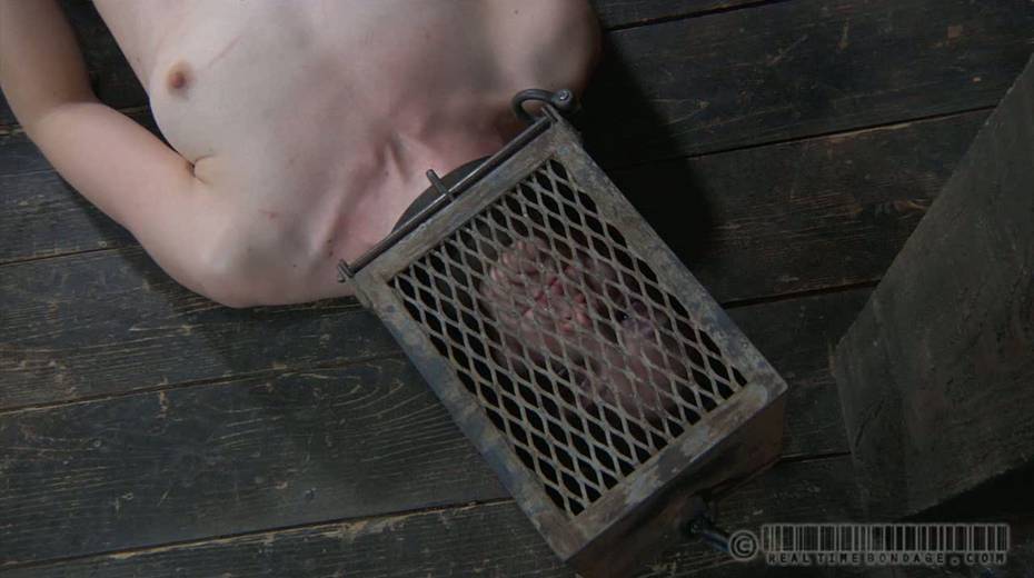 Chick with metal box on her head moans and fucks her clit with vibrator