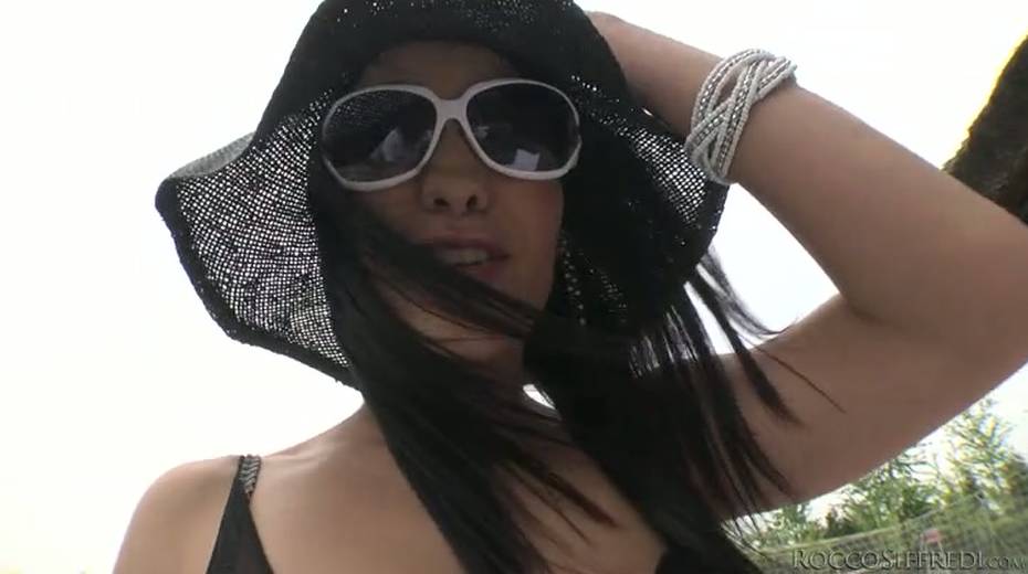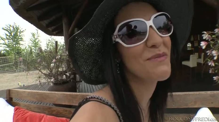 Wondrous busty curvy brunette in big hat masturbates at the backyard