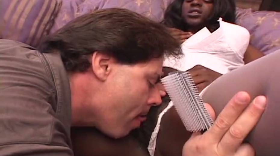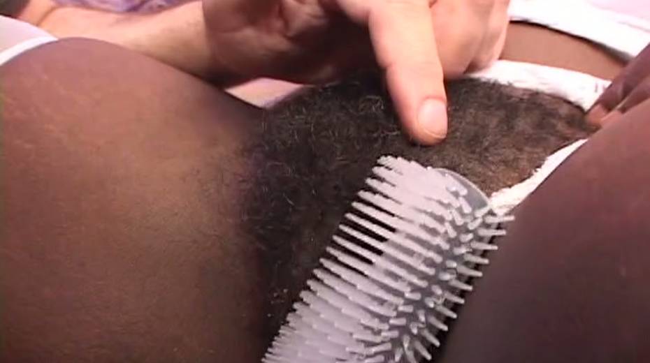 Chubby ebony bitch gets her pubic hair brushed before sex