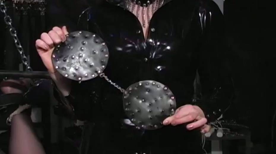 Hot dominatrix tickles her slave's feet and punishes his balls