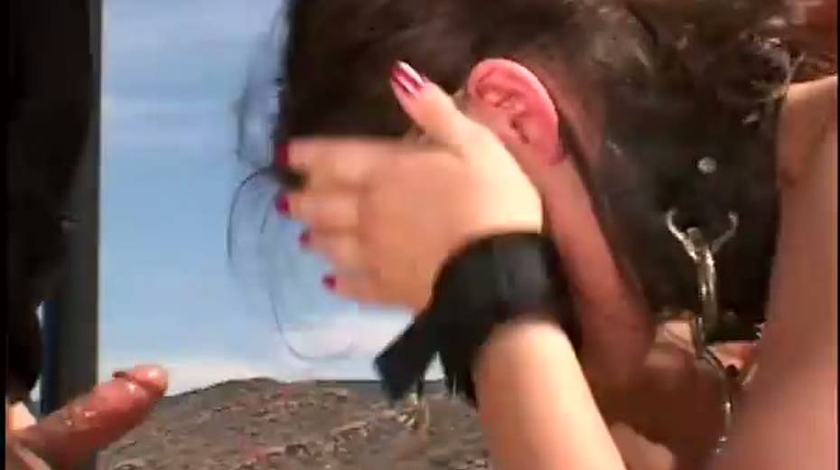 Horny brunette bitch banged in threesome under the sun