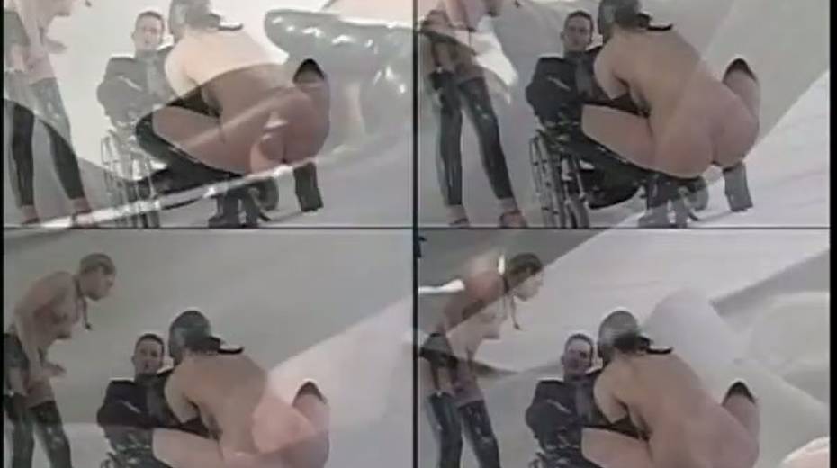 Two nude chicks fuck one clothed dude on a wheel chair