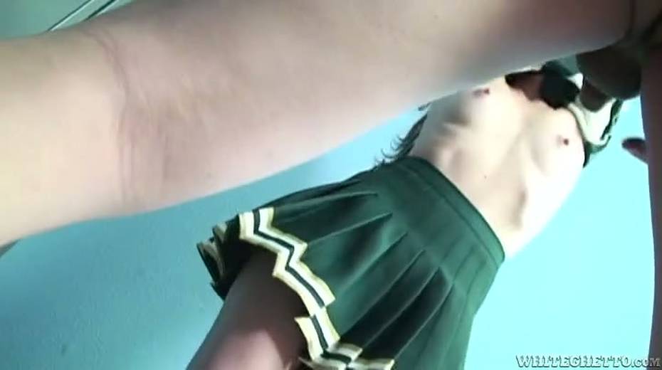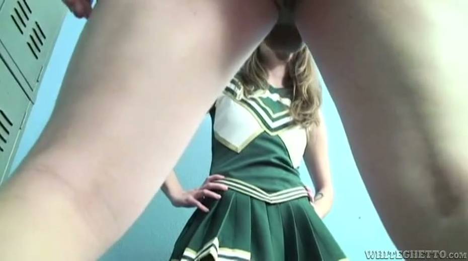 Fierce teen in cheerleader's costume gets hard on submissive dude