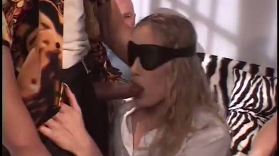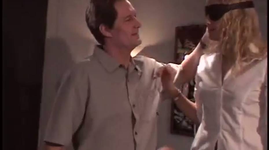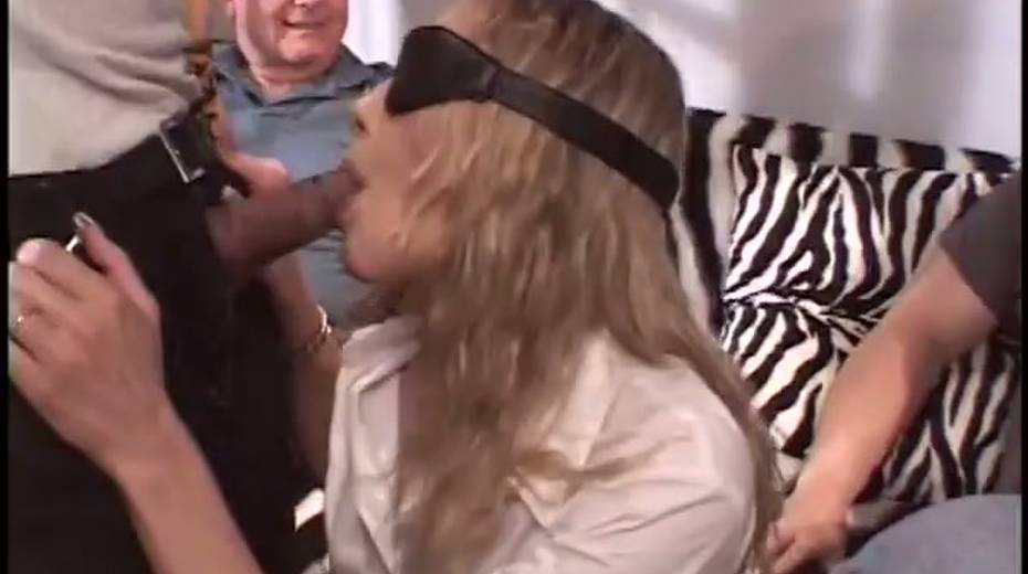 Blindfolded MILF fucks two horny studs while her hubby is watching