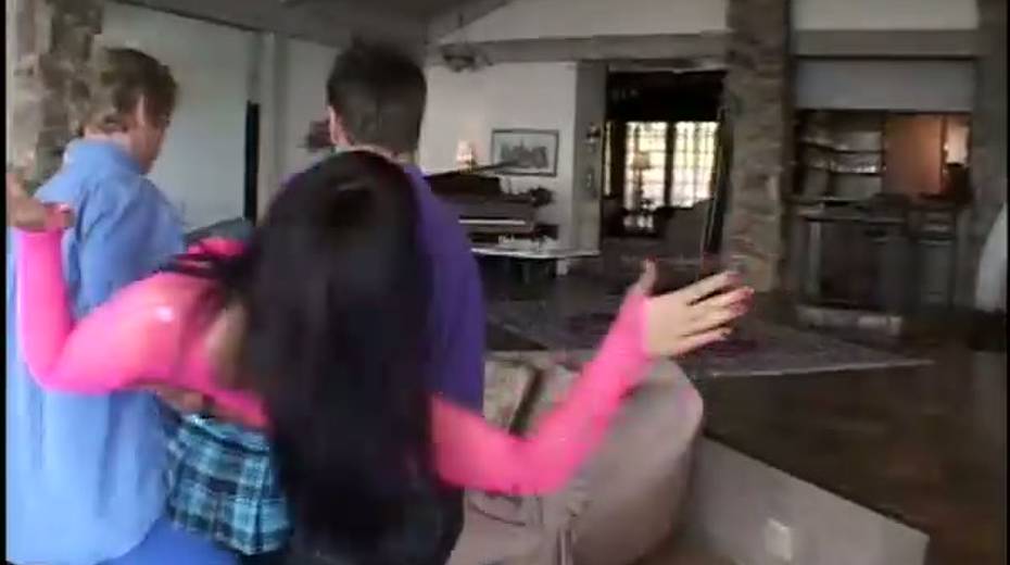 Voracious slut in fishnet stockings fucks two horny studs in threesome
