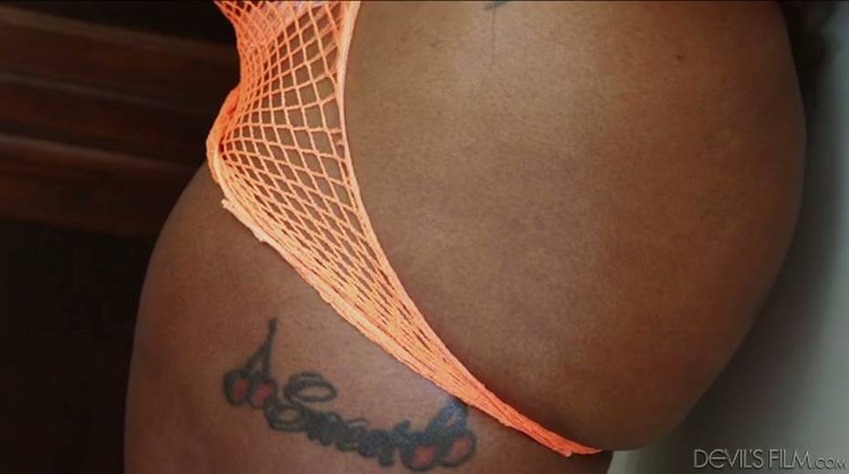 Curvy black hoe wearing orange fishnet gets her juicy ass doggy fucked