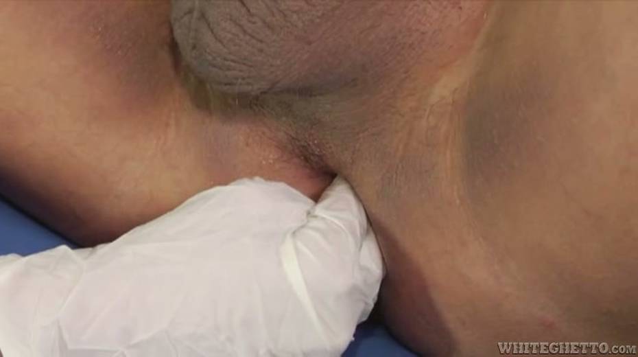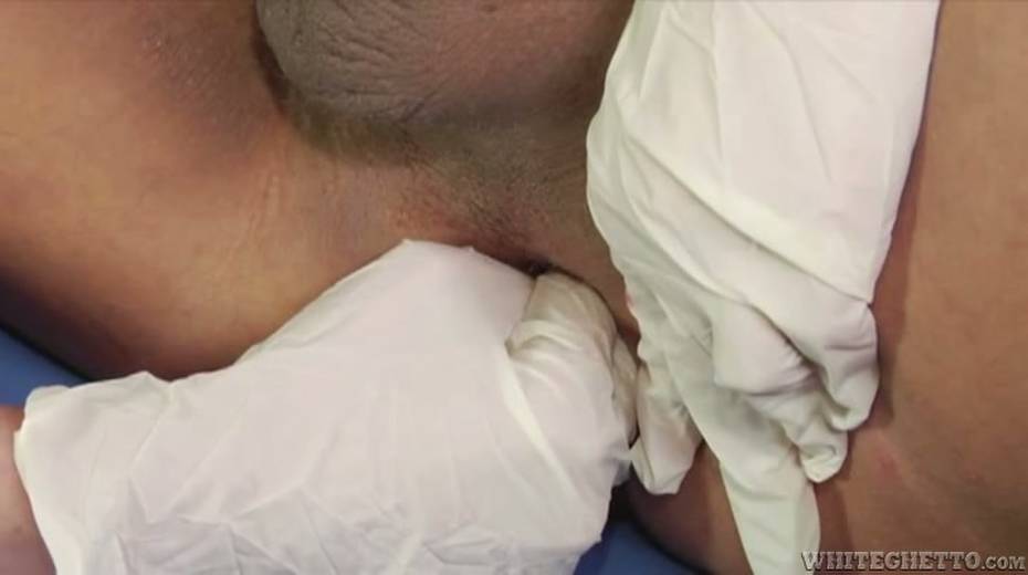 Slim brunette gives blowjob and examines anal hole wearing gloves