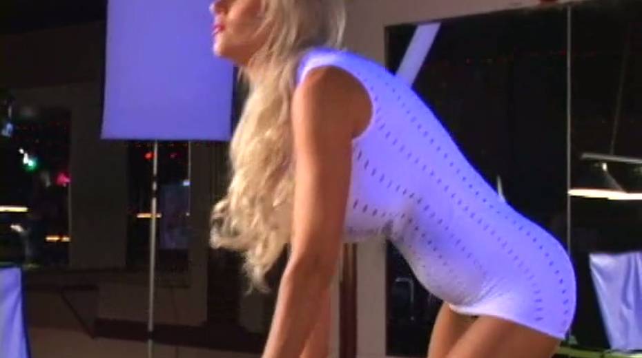 Long legged gorgeous blonde Puma poses in hot stuff on camera