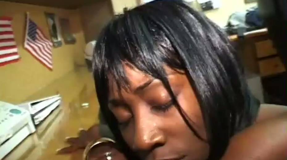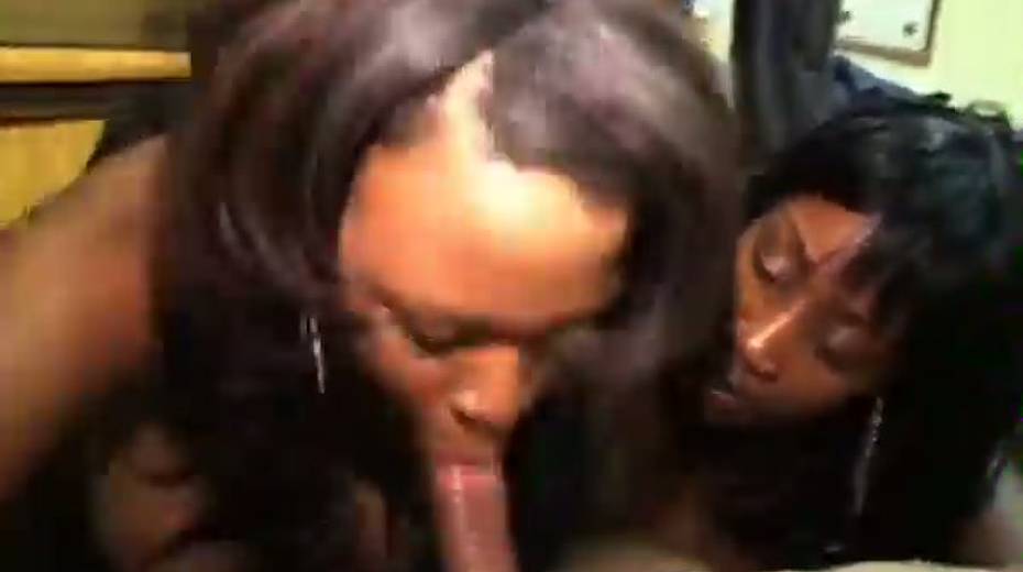 Two sexy ebony chicks share their colleague's cock in hot threesome
