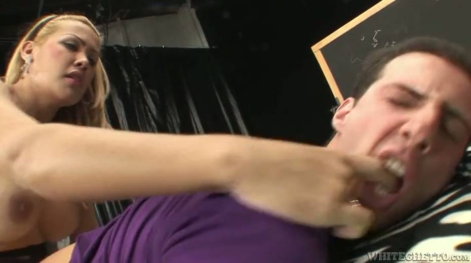 Horny shemale slut in fishnet pantyhose fucks tight ass doggy style
