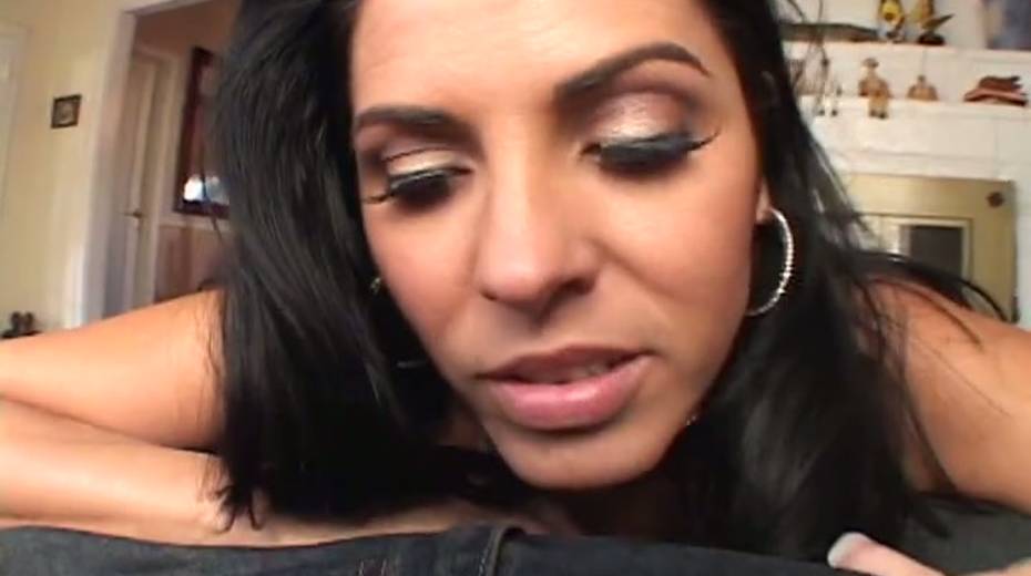 Sexy brunette babe with juicy jugs sucking meaty cock balls deep