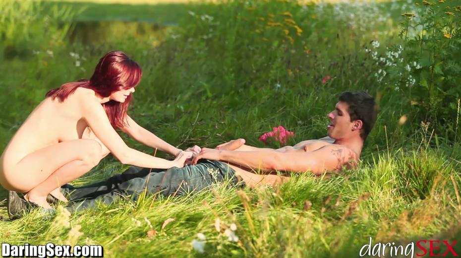 Redhead pale skin teen cutie spreads her legs outdoors