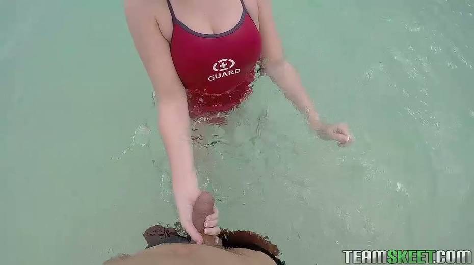 Slutty light haired lifeguard provides dude's cock with a blowjob
