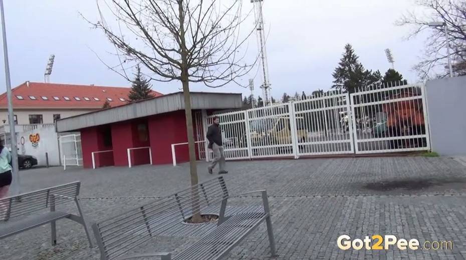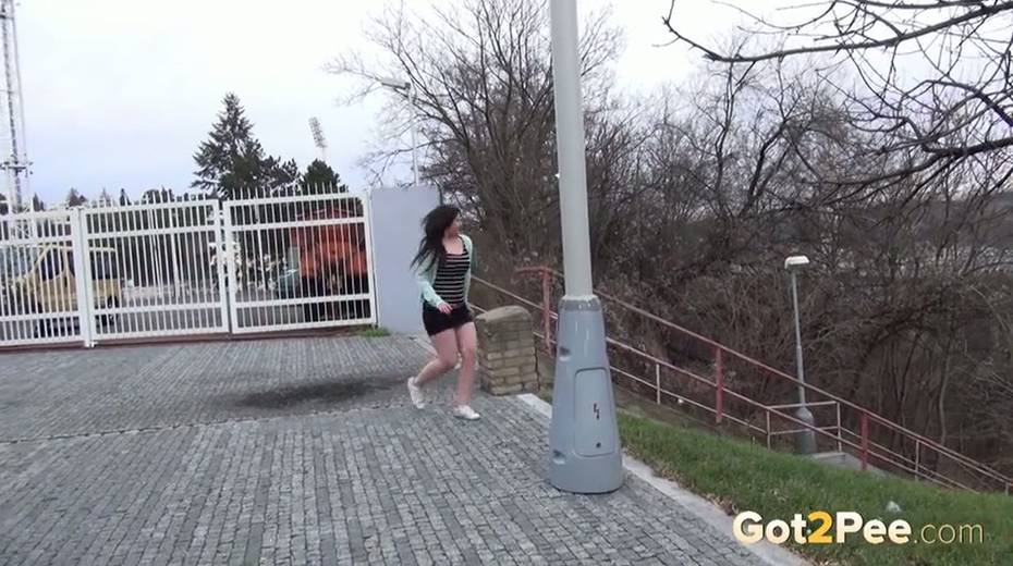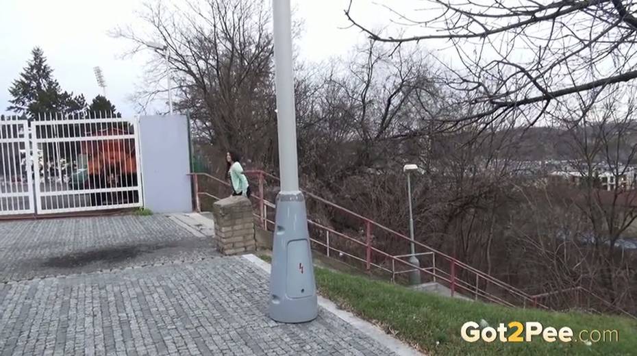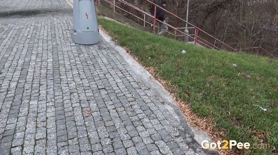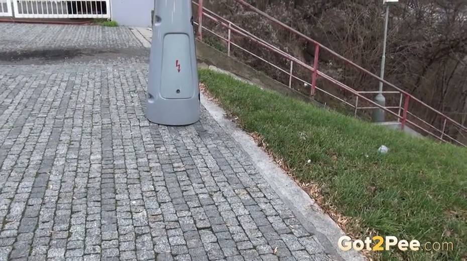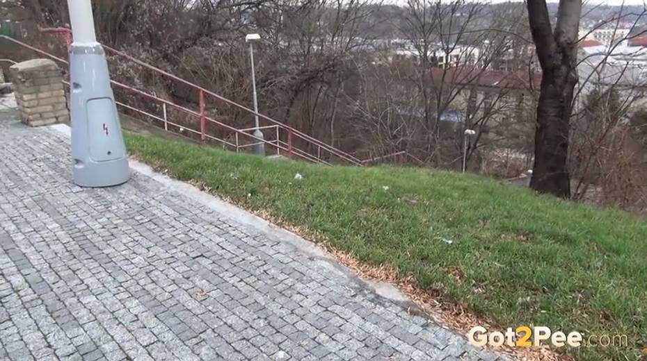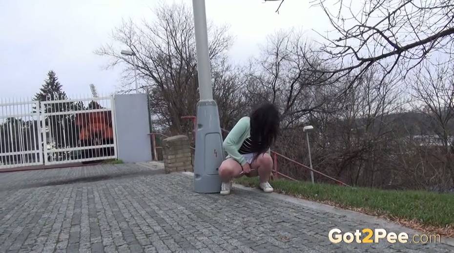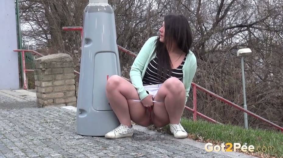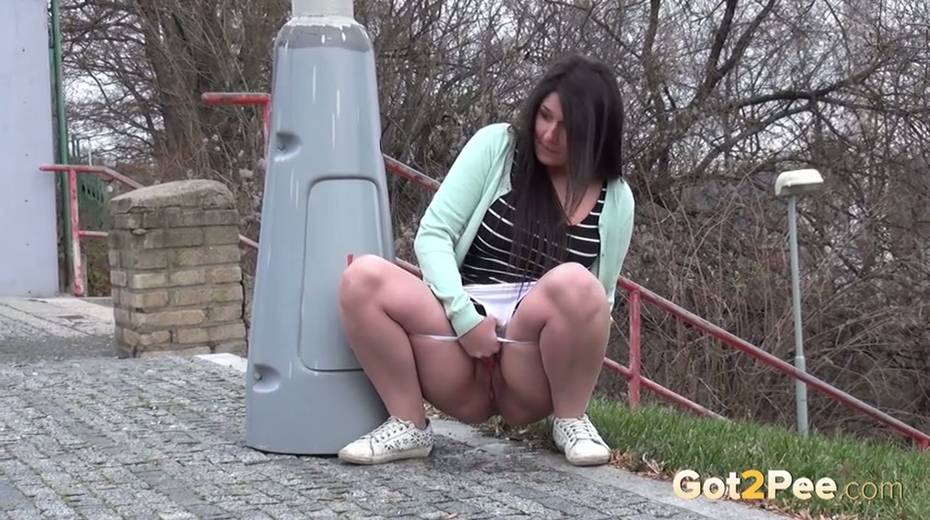 Bootylicious brunette chick pulls down her thongs to pee outdoors