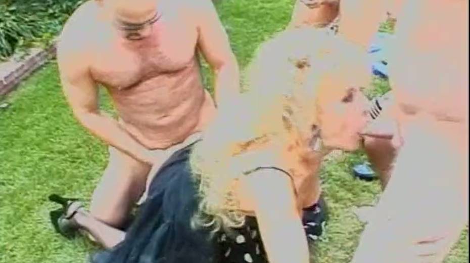 Mature blonde slut in polka dot dress gangbanged outdoor