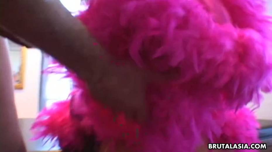 Hot Asian bitch in pink sex suit put in cage to get anally fucked hard