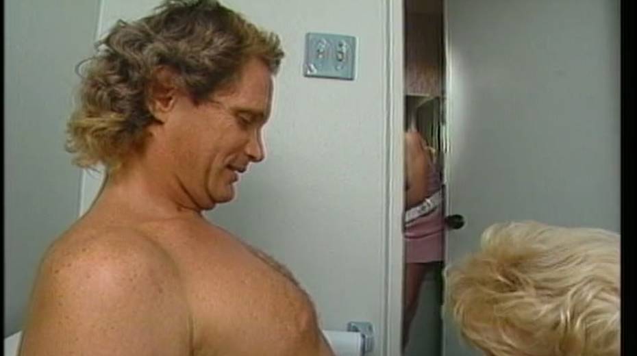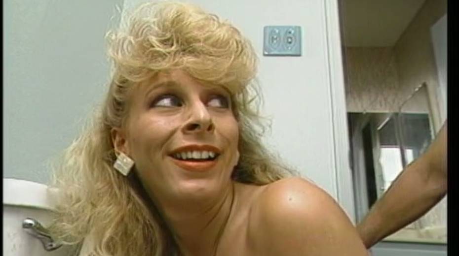 Retro sex video with thirsty girls blowing one big cock in a bathroom