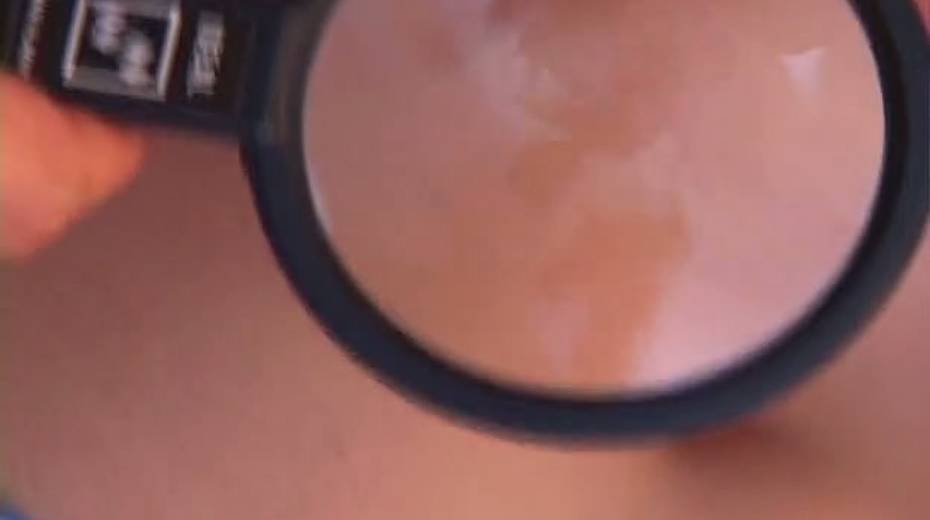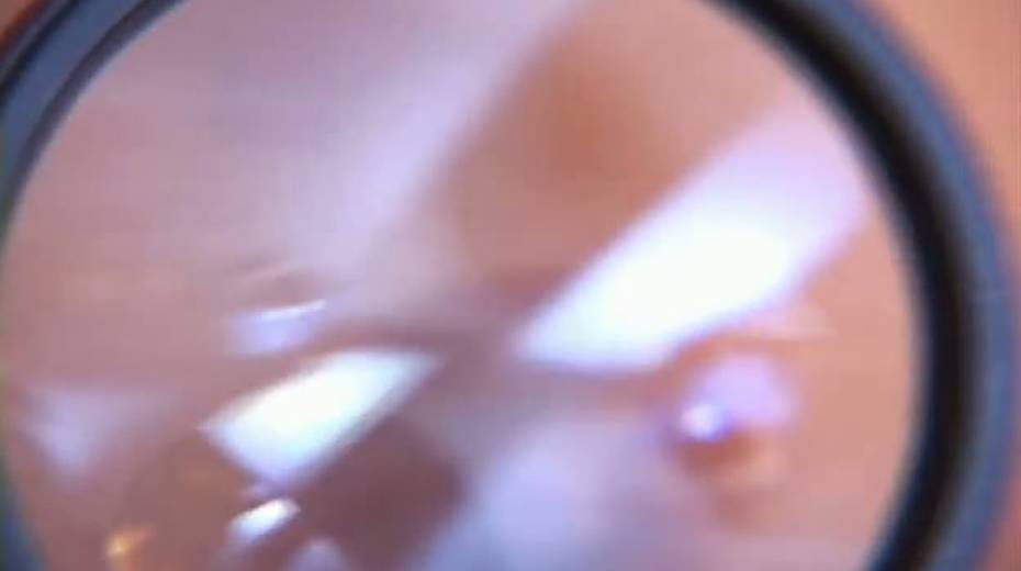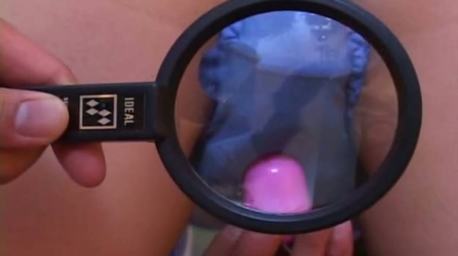 Dudes with poor eyesight use magnifier and toys to examine brunette gal