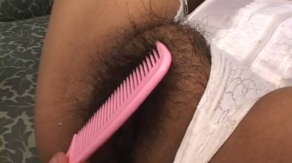 Nasty gal is combing her hairy pussy and giving blowjob to a duo of dudes