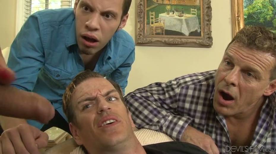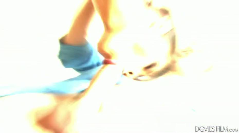 Busty shemale slut gives sloppy deepthroat blowjob in blowgang session