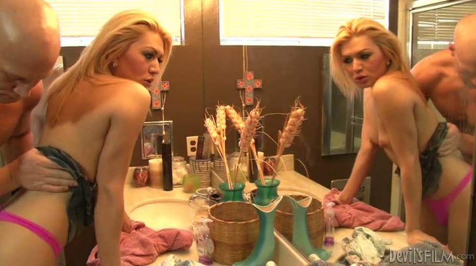 Bald headed stud gives rimjob and fucks anus of slutty shemale chick in front of the mirror