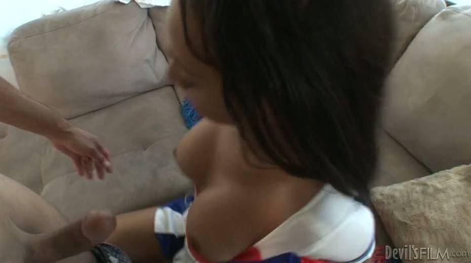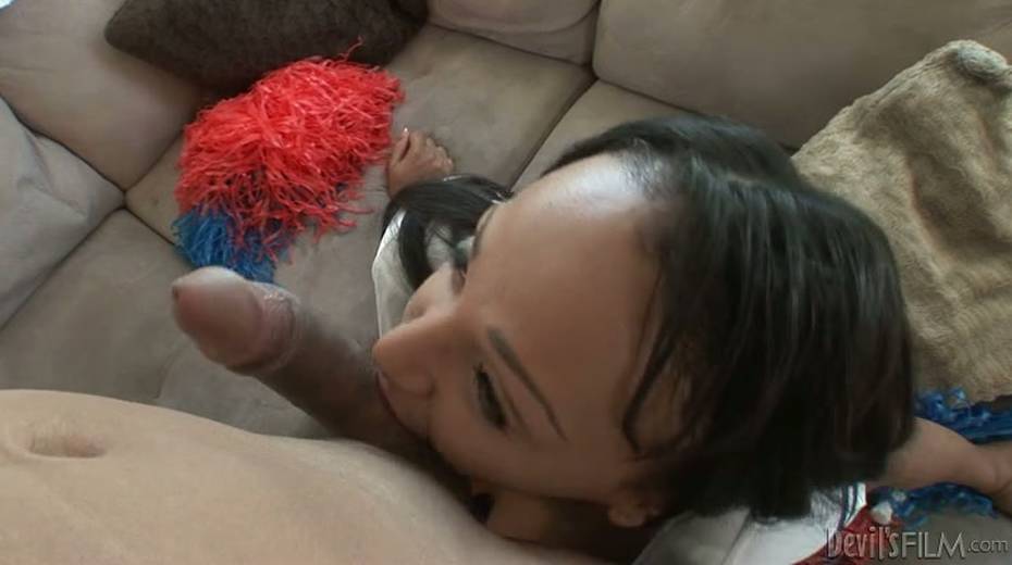 Horny tranny sits down to look at him sucking her stiff cock