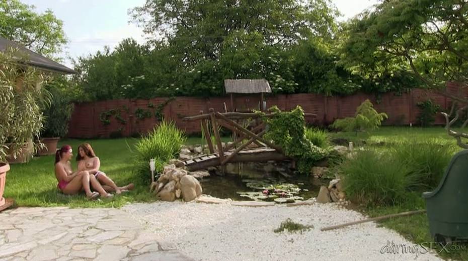 Erotically charged babes are having sex in the garden