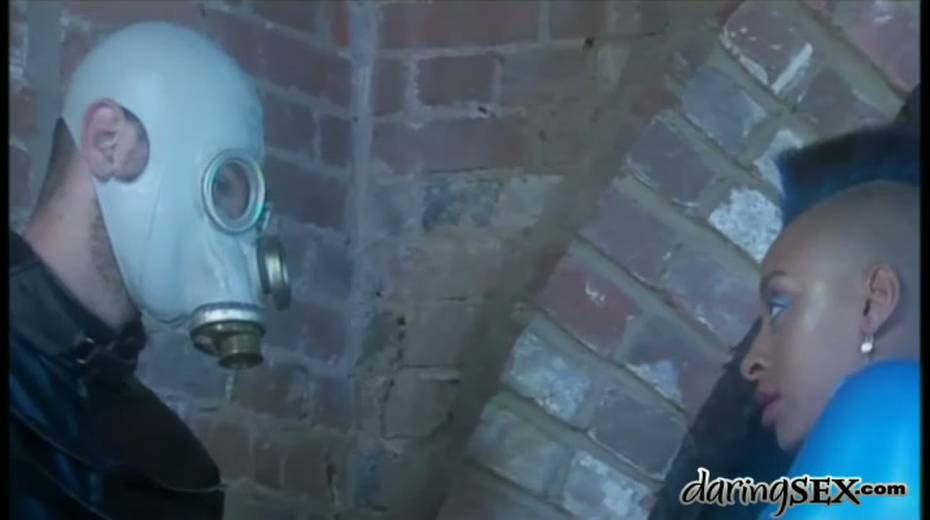 Gas mask guy is having fun with his chocolate girlfriend