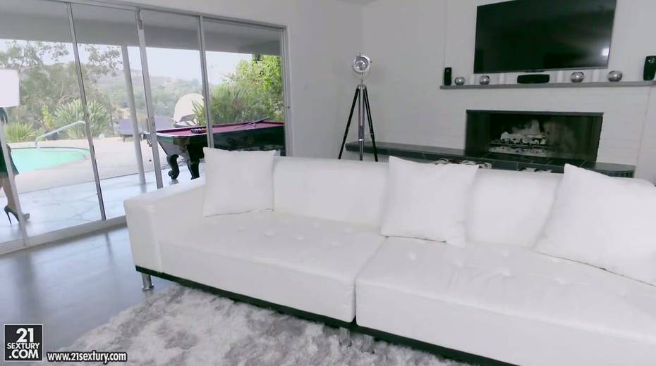 Busty brunette with pierced nipples Jaclyn Taylor gets laid on a white couch