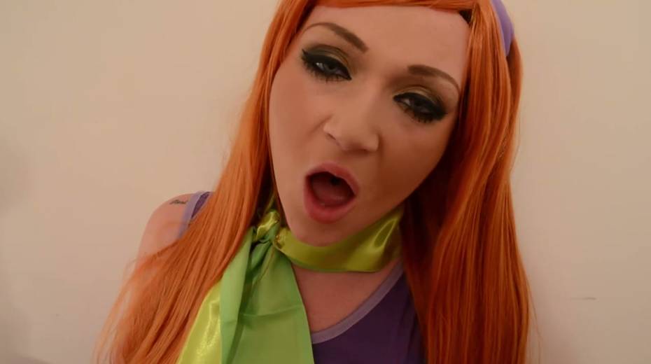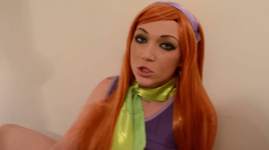 Red haired porn model in Daphne Blake cosplay outfit gives good blowjob