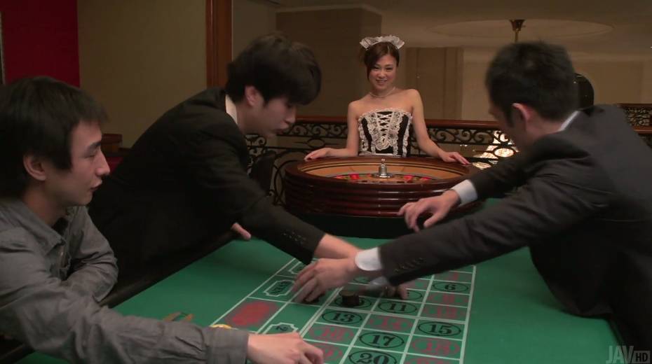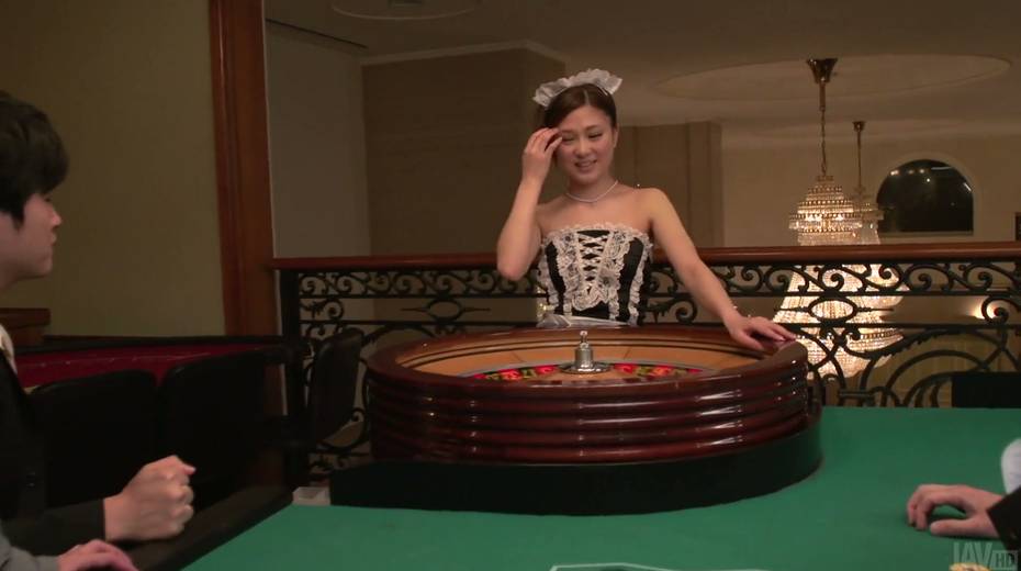 Cute Asian chick wearing waitress uniform Maki Horiguchi gives blowjob to one client