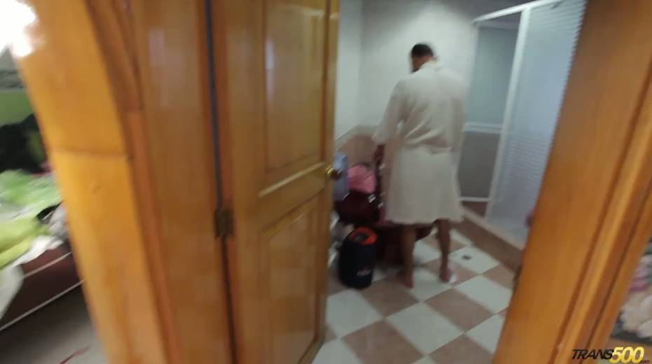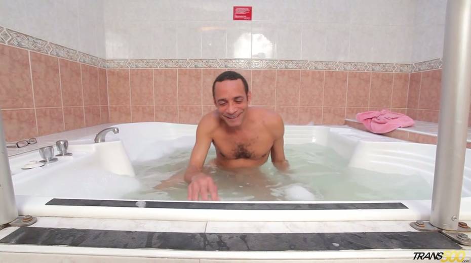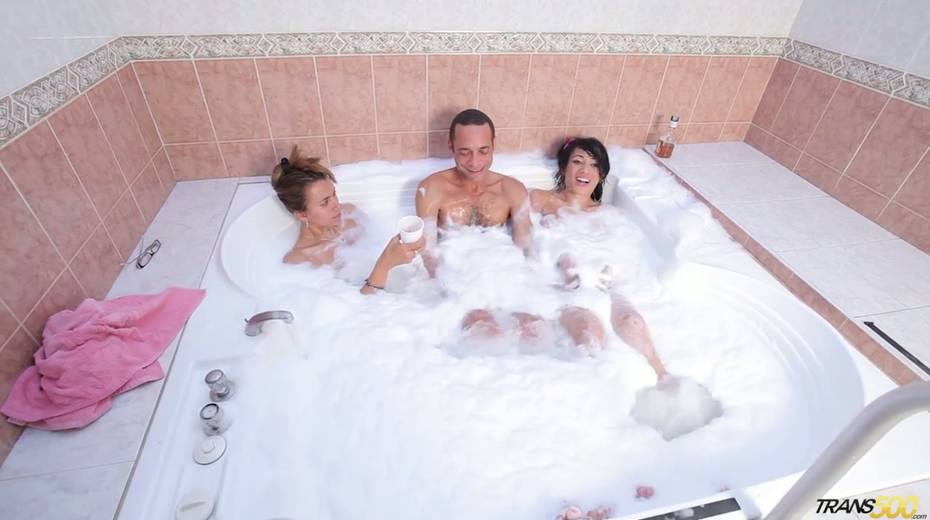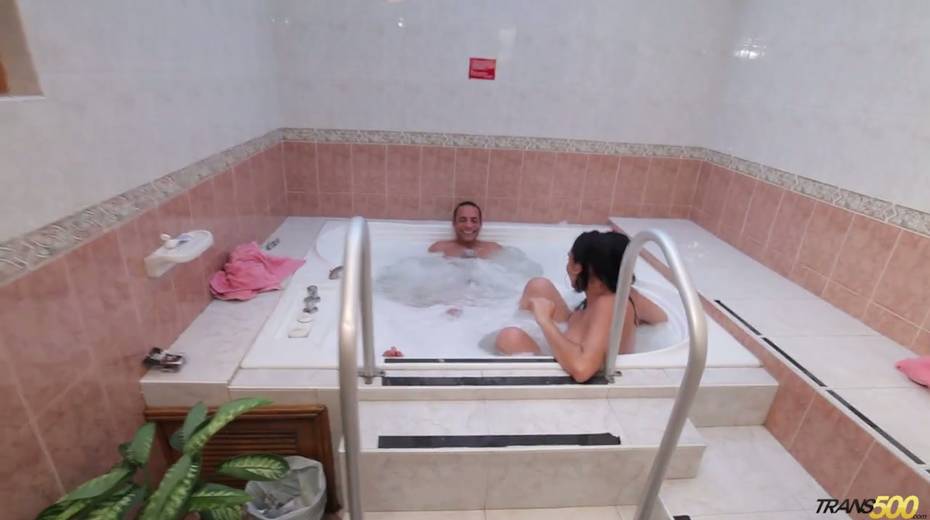 Dude with giant dick is going to fuck two ladyboys in the jacuzzi