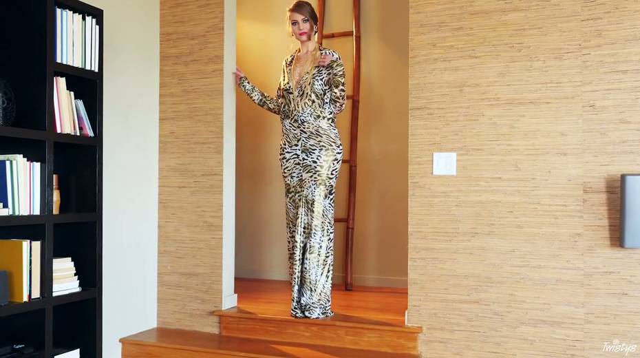 Milf in long dress Jenna Justice strips and masturbates muff